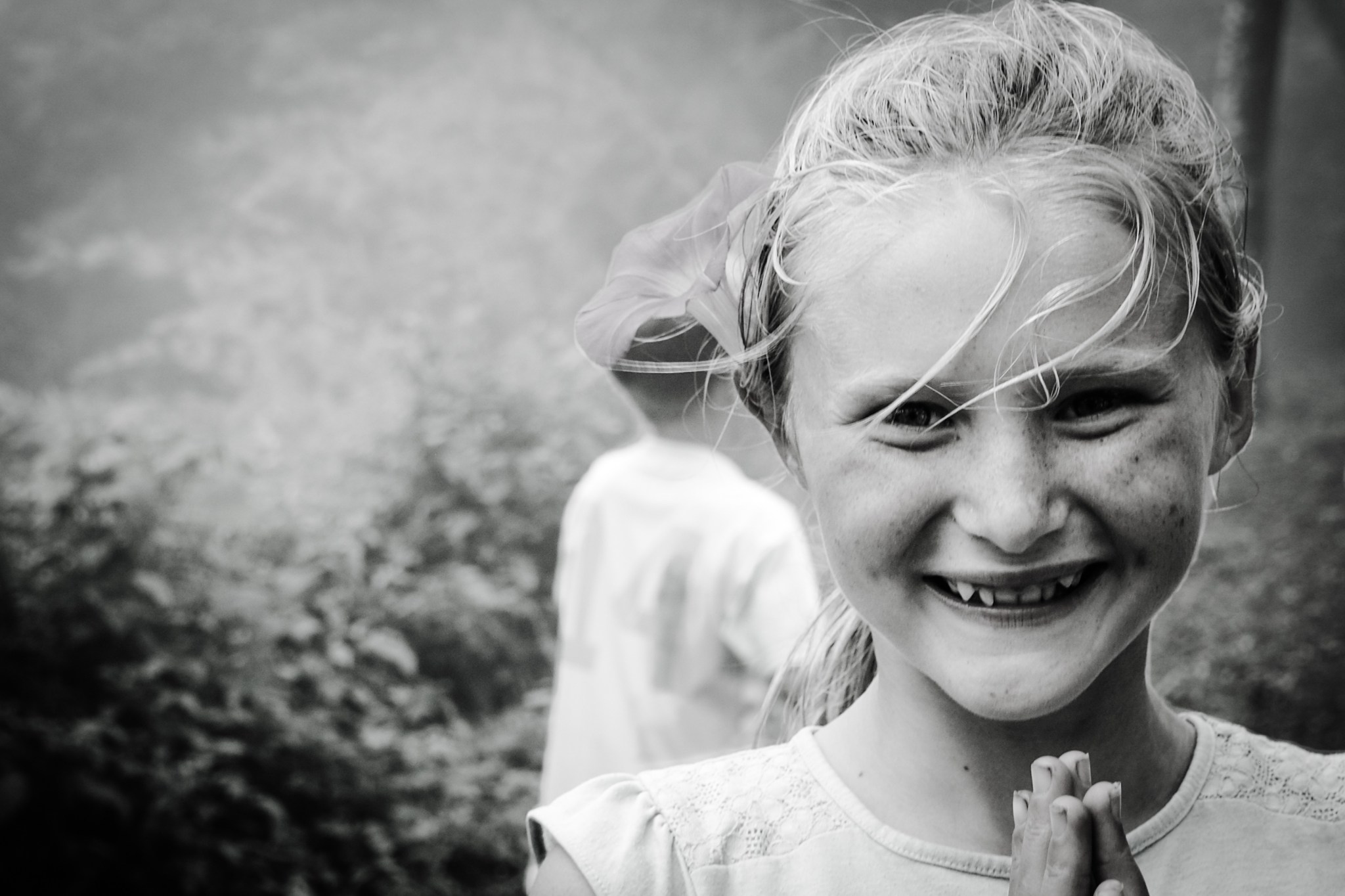 with a carefree smile