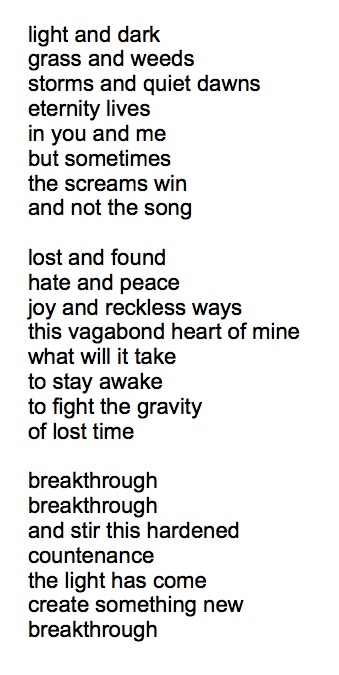 we people are a funny mix don’t you think or at least i am anyway sometimes the sun is shining smiles and laughs no room for whining like i want to photograph every moment capture the rapturous mood i’m in and at the same time no really at the same time rain pours down all around this town of memories that sprouts like massive trees in a forest of lies and shame and why’s and pain and ties to the past that seem to last like a long sad song so i pray break through in rays of hope and light dear Lord help me regain my sight and “though the wrong seems often so strong” You will make all things right ‘cause You’re writing a story full of downpours and clouds writing a story of songs sung out loud of Your love and Your glory of the way that you carry this tale called my life in Your everlasting arms i am choosing to rest to stop and embrace the things i don't see to silently wait to just.... be and see you breakthrough all the rainy and cloudy in me breakthrough and one day make all things new