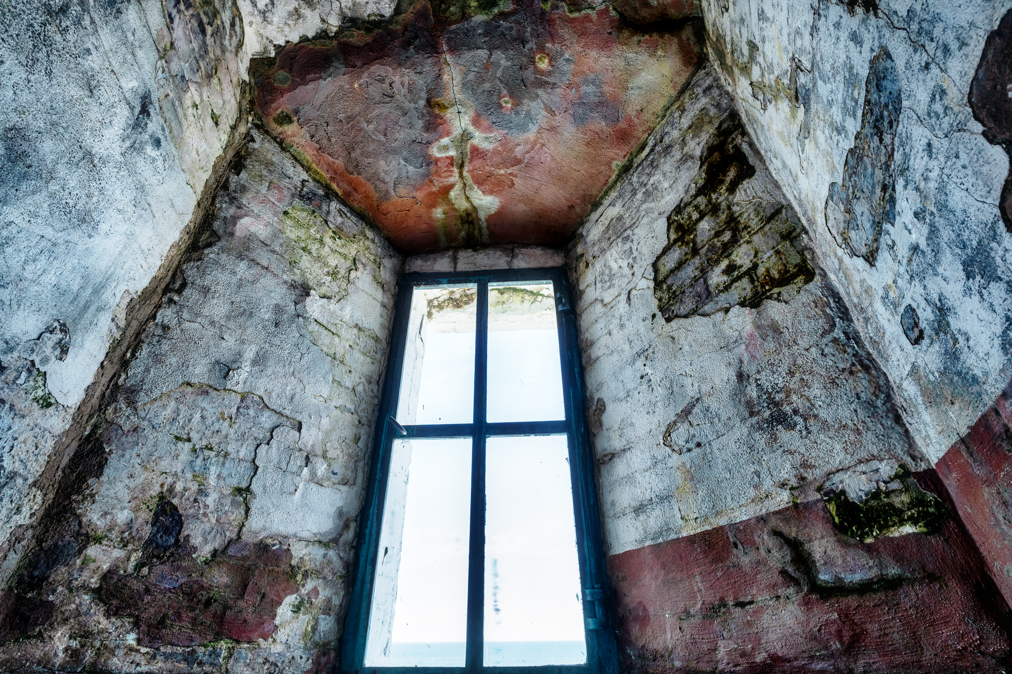 I indicated in my previous post that I would post what I saw at the top, forgetting that I had a few images of the windows I passed as I wound my way up through the lighthouse. These two images are the same window with different “moods” and perspectives. Thanks for stopping by.